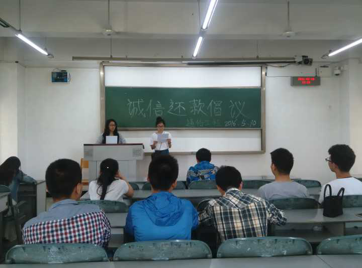 会议开始由申请生源地贷款的学生代表宣读《诚实守信倡议书》,然后由腾老师向同学们阐述了诚实守信的重要性及诚信还款对个人信用的影响,最后所有到场的学生都谈了自己对于诚信还款的想法及个人还款计划,并签署了个人诚信还款承诺书。
