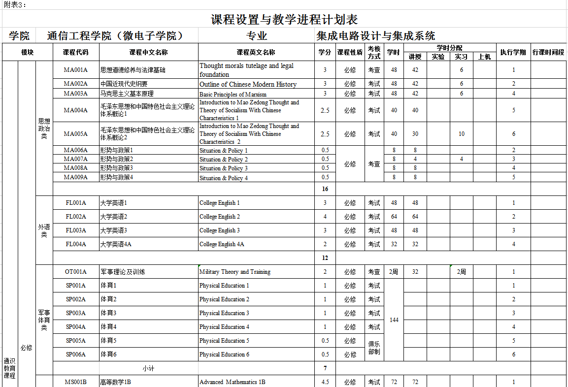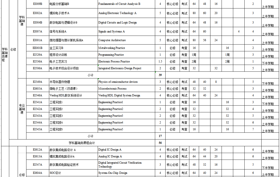 主要专业核心课程(11门):电路分析基础B、模拟电子技术A、数字电路与逻辑设计B、微处理器与微计算机系统A、信号与系统A、半导体器件物理、微电子工艺、模拟集成电路设计A、数字集成电路设计A、Verilog HDL数字系统设计、数字集成电路验证技术。