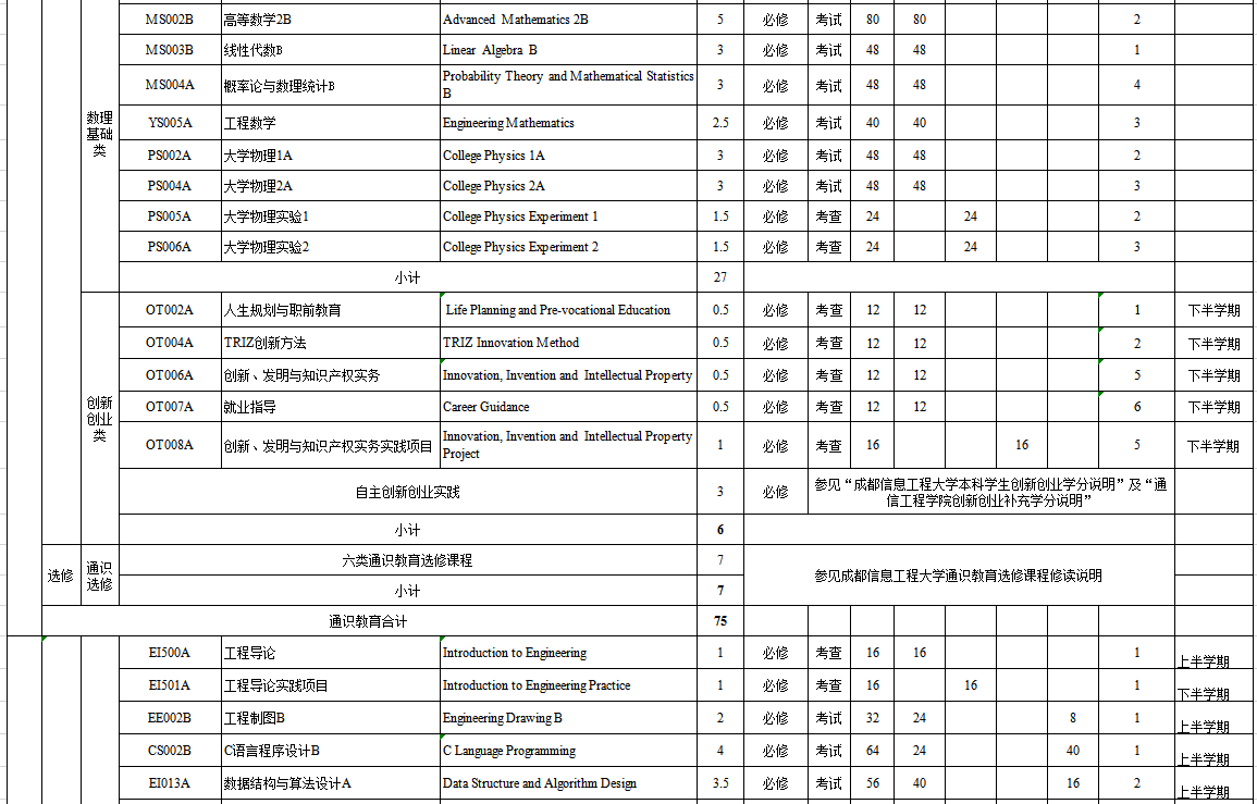 四、创新创业教育环节的学分认定,按照《成都信息工程大学本科学生创新创业活动及创新创业实践学分认定办法》规定执行,学生在完成创新创业课程类学习及通过参加相关实践环节满足条件后可获得该项学分。