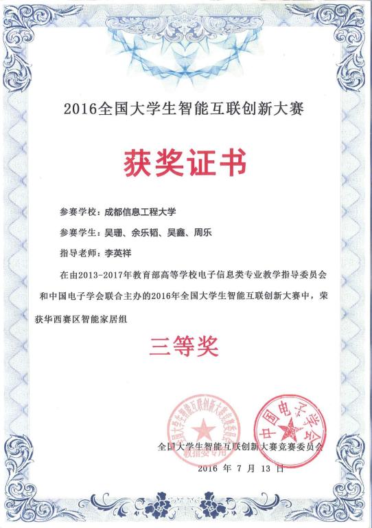 2016年7月11日-7月13日,由2013-2017年教育部高等学校电子信息类专业教学指导委员会、中国电子学会主办,上海交通大学,浙江大学,华中科技大学,重庆邮电大学,北京邮电大学承办,由 ARM、Xilinx、ST、ADI、Google 公司以及清华大学出版社协办的“全国大学生智能互联创新大赛”华西赛区决赛在重庆邮电大学举行。