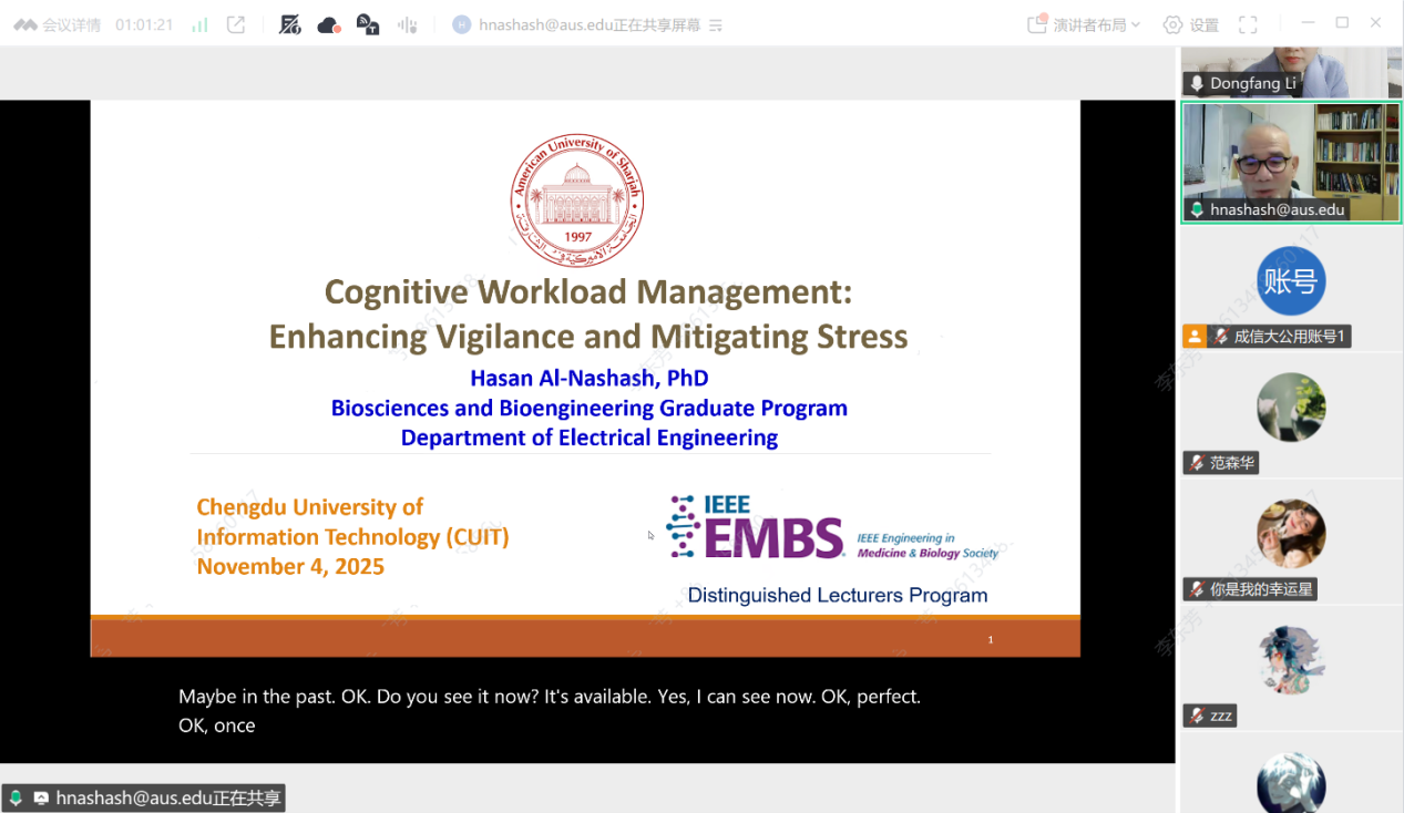 沙迦美国大学Hasan教授以“Cognitive Workload Management:Enhancing Vigilance and Mitigating Stress”为题做报告