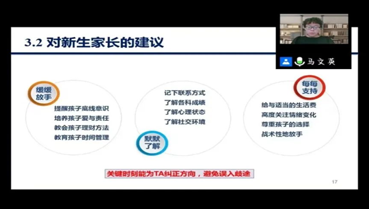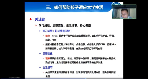 陈鹏飞首先向家长介绍了学校的地理位置、气候环境、硬件设施、校园环境等基本情况、让家长对学校有了全面了解。然后提醒新生开学前所需要证件资料、学习生活用品,并对学校防控政策进行详细宣讲,保证新生入学顺利。最后分享了新生进入大学后,家长应该扮演什么角色,来帮助学生尽快适应大学生活。同时建立了家长微信群,方便能在第一时间将重要信息告知家长,并且能让家长们的问题困难得到及时解决。