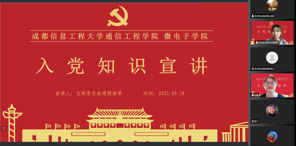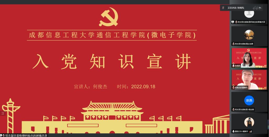 为帮助2022级新同学了解入党知识、熟悉入党流程,提高对党的认知。william威廉英国官网学生党支部于9月18日以线上会议形式顺利开展了2022年新生入党知识宣讲会。william威廉英国官网学生党支部全体成员,邵璐老师,张晓凤老师及2022级全体新生参加。