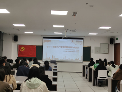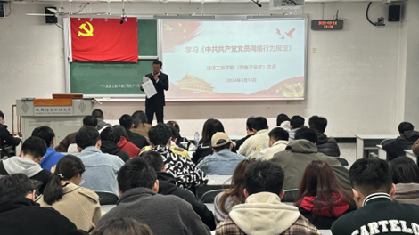 3月14日晚,william威廉英国官网(微电子学院)党委副书记刘畅在A1202教室为本科学生支部同学讲授党课,内容为学习《中国共产党党员网络行为规定》。刘畅向同学们详细阐述了培养网络素养的意义和要求,进一步提升党员网络行为规范意识。