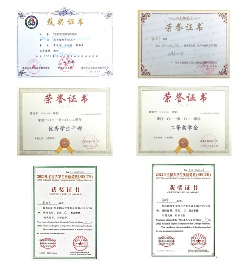 青怡宁,中共预备党员,通信工程专业201班团支书。在思想上有较高的政治素养;在学习上刻苦努力,专业成绩位于年级前茅;在工作上认真负责,按时保质完成组织与老师布置的任务;在生活上乐于助人,积极参加志愿者活动。她始终以一名党员的标准严格要求自己,起到了党员的先锋模范作用,她执着进取的精神,积蓄着梦想的力量。她那初露尖角的身影,绽放着成长的芬芳,她用自己的实际行动展示了一名优秀学生的思想觉悟和优秀品质,散发着自己的光和热。曾获五一数学建模竞赛二等奖、全国大学生英语竞赛二等奖和三等奖、2021-2022学年二等奖学金,连获两届“优秀学生干部”称号。